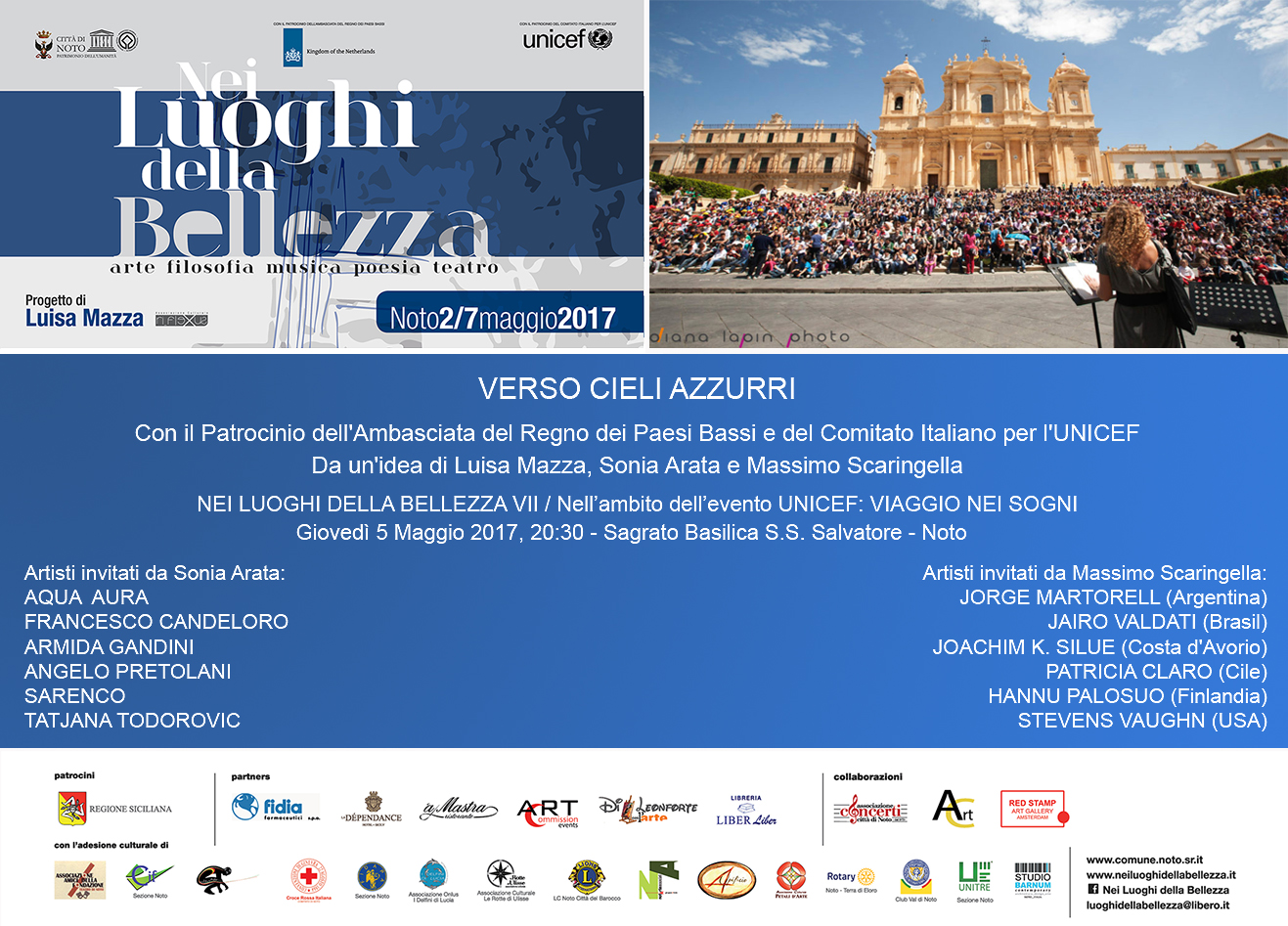 Nell'ambito dell'evento "Viaggio nei Sogni", il cui programma vede l' intervento straordinario del Dott. Giacomo Guerrera, Presidente UNICEF Italia e della Dott.ssa Carmela Pace, consigliera nazionale UNICEF, sarà presentato il progetto "Verso cieli azzurri", videoproiezione delle immagini realizzate dagli artisti invitati, autori di rilievo nel panorama dell’arte contemporanea.